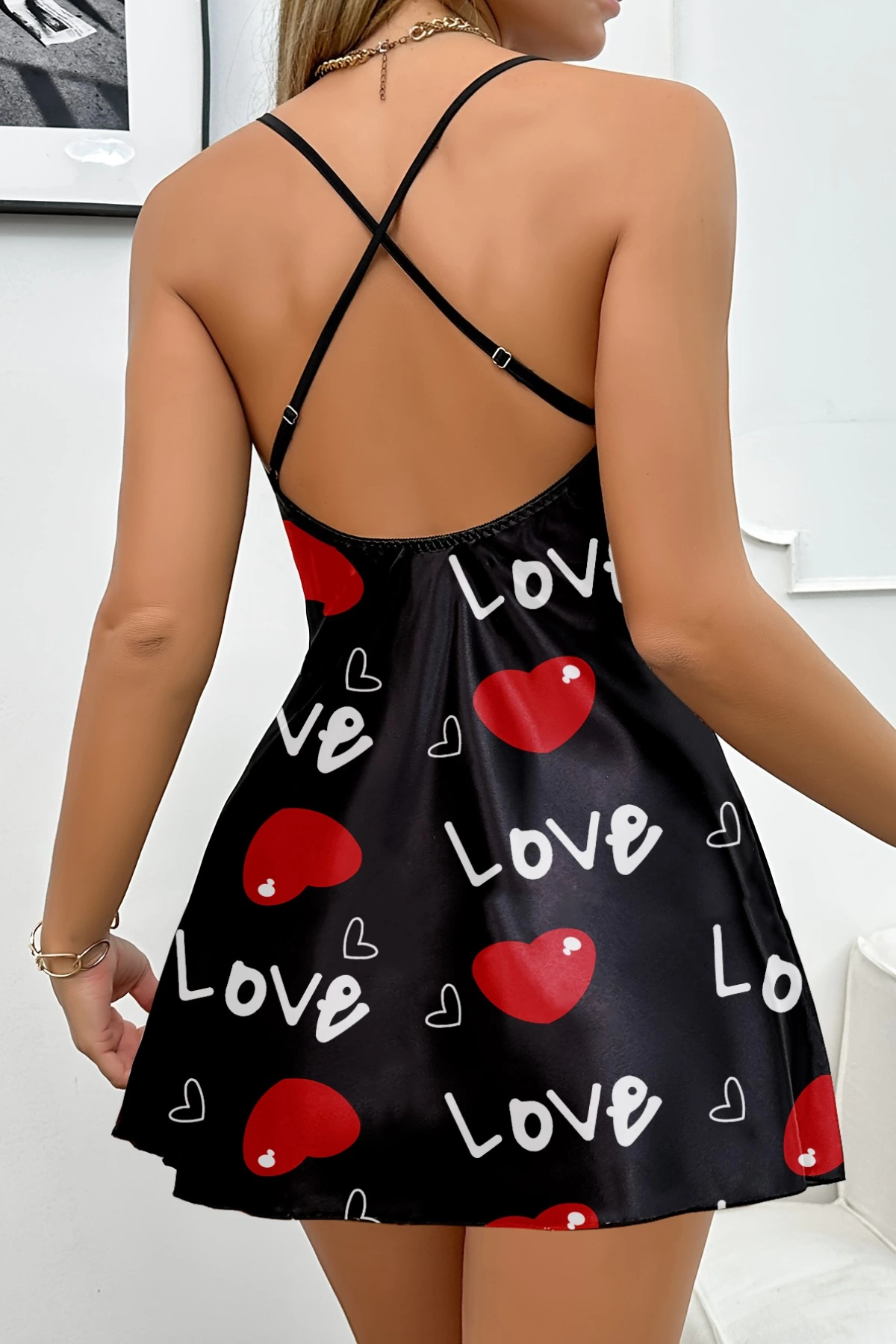 Aşk Temalı Kalp Desenli Siyah Saten Gecelik