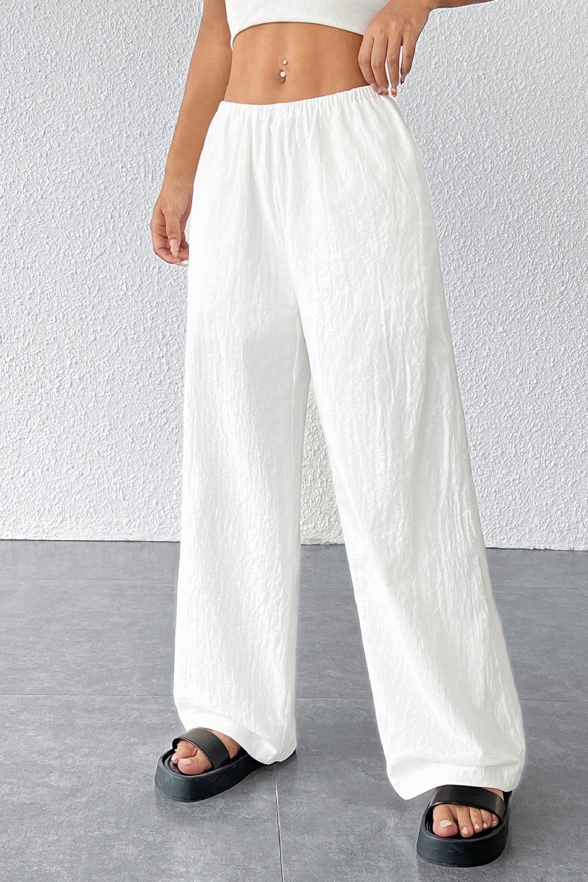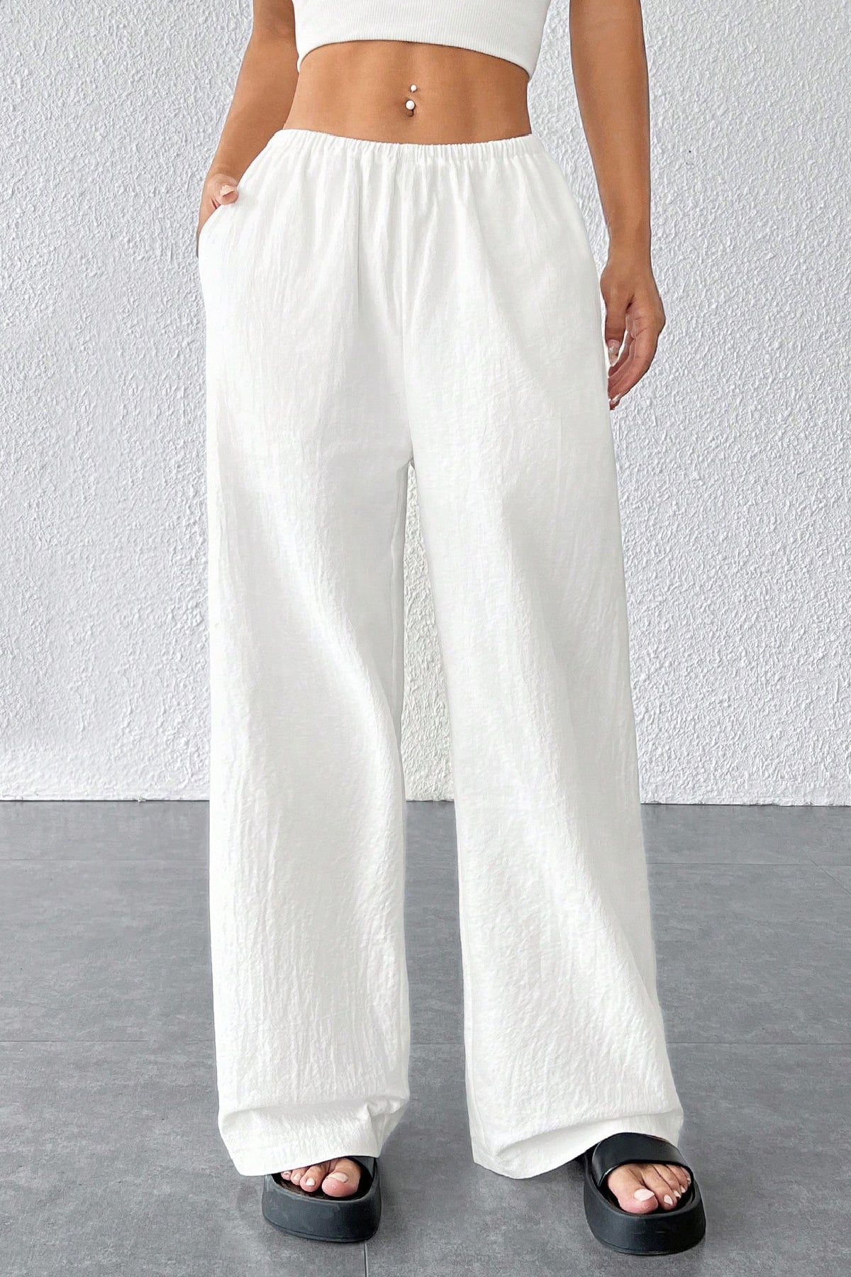 Günlük gezilerde, tatilde ya da ofis şıklığında kolayca kombinlenebilen bu kadın pantolon, beyaz rengiyle her tarza uyum sağlar.