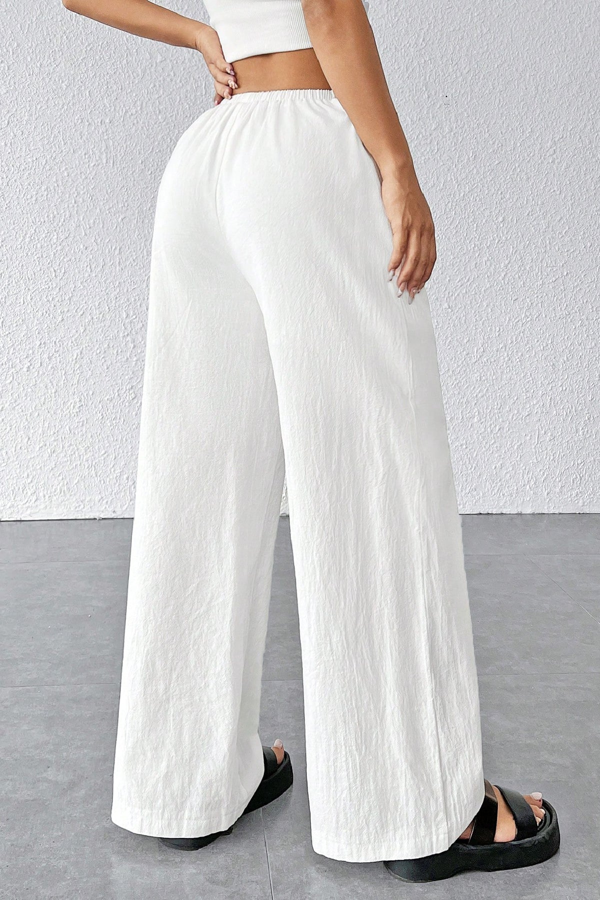 Şıklık ve rahatlığı bir arada sunan kadın beyaz bol kesim geniş paçalı çift cepli dökümlü pantolon, günlük kullanım ve özel kombinler için ideal bir seçimdir.