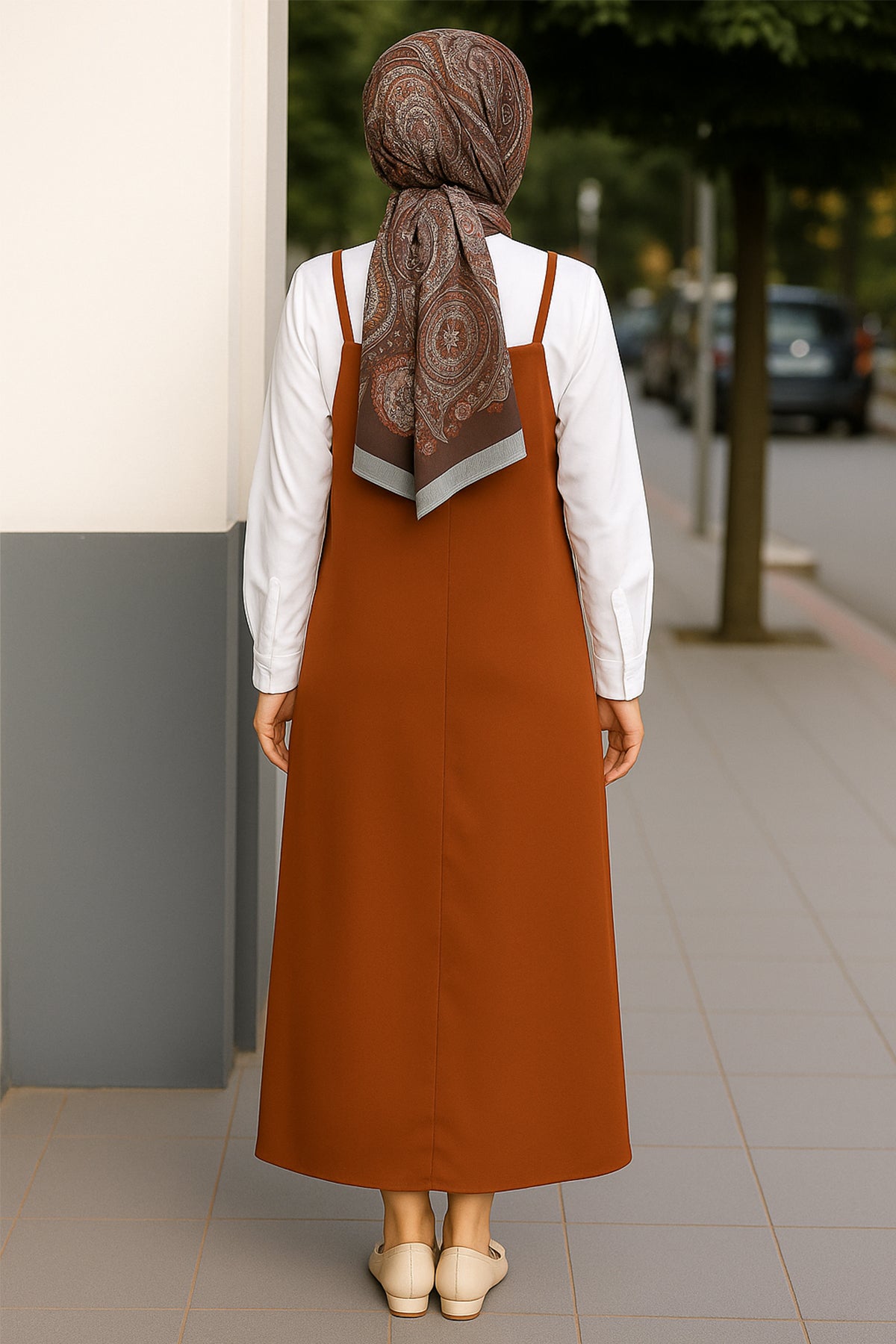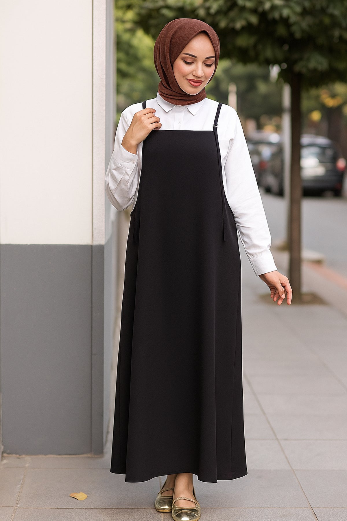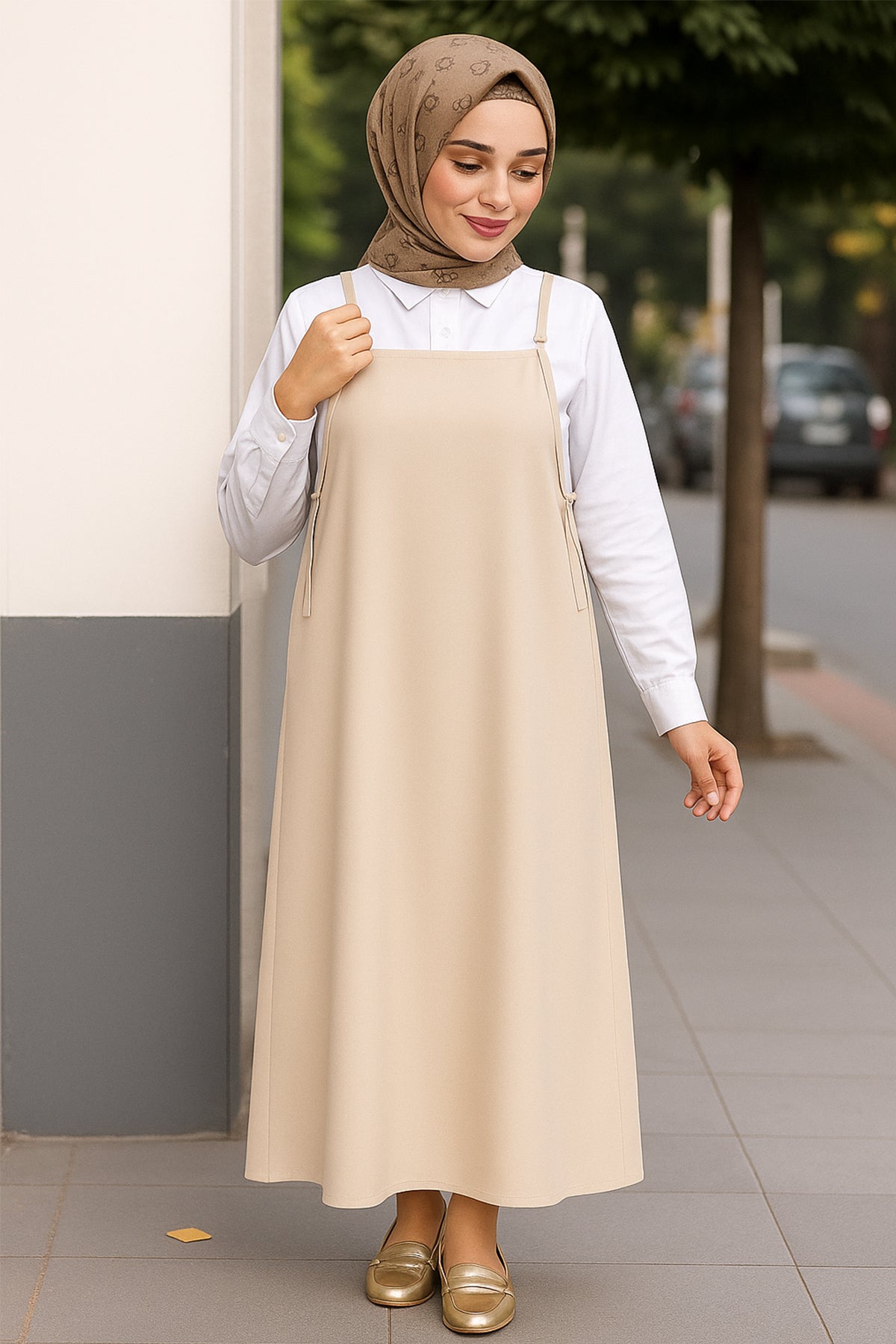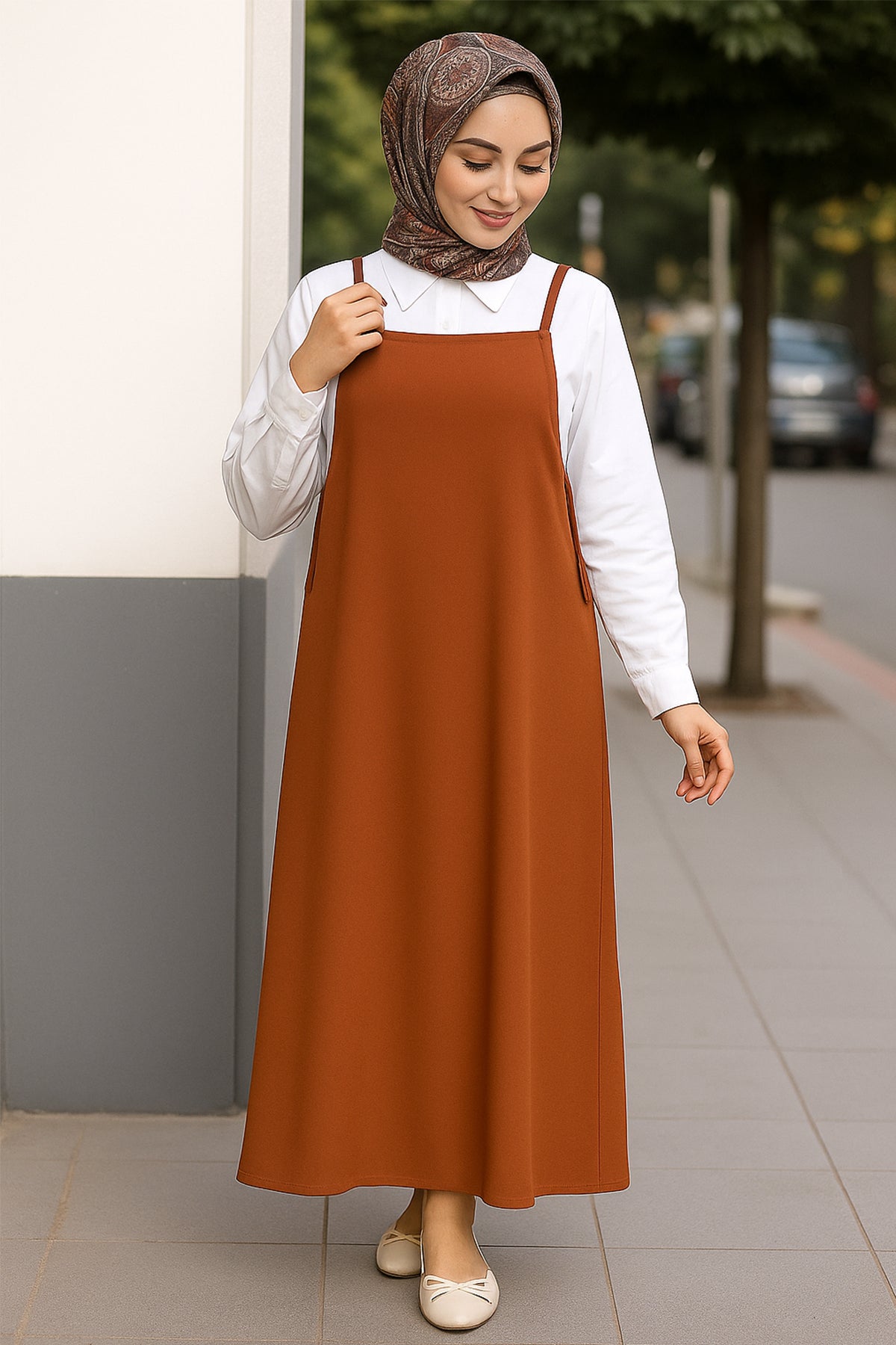 Her kadının dolabında mutlaka bulunması gereken bu kadın kahverengi askılı jile elbise, hem şık hem de pratik kombinler için ideal bir seçim.