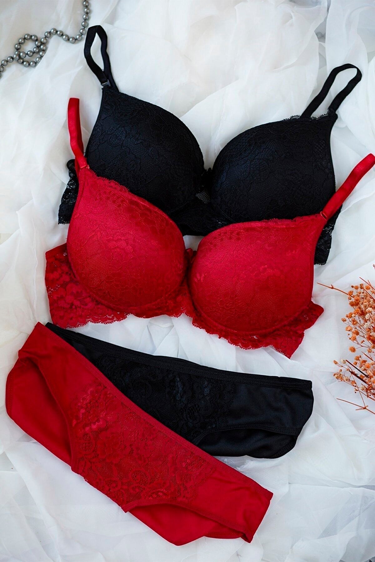 Kadın Siyah Ve Kırmızı Dolgulu Balenli Sütyen Külot 2'li Paket