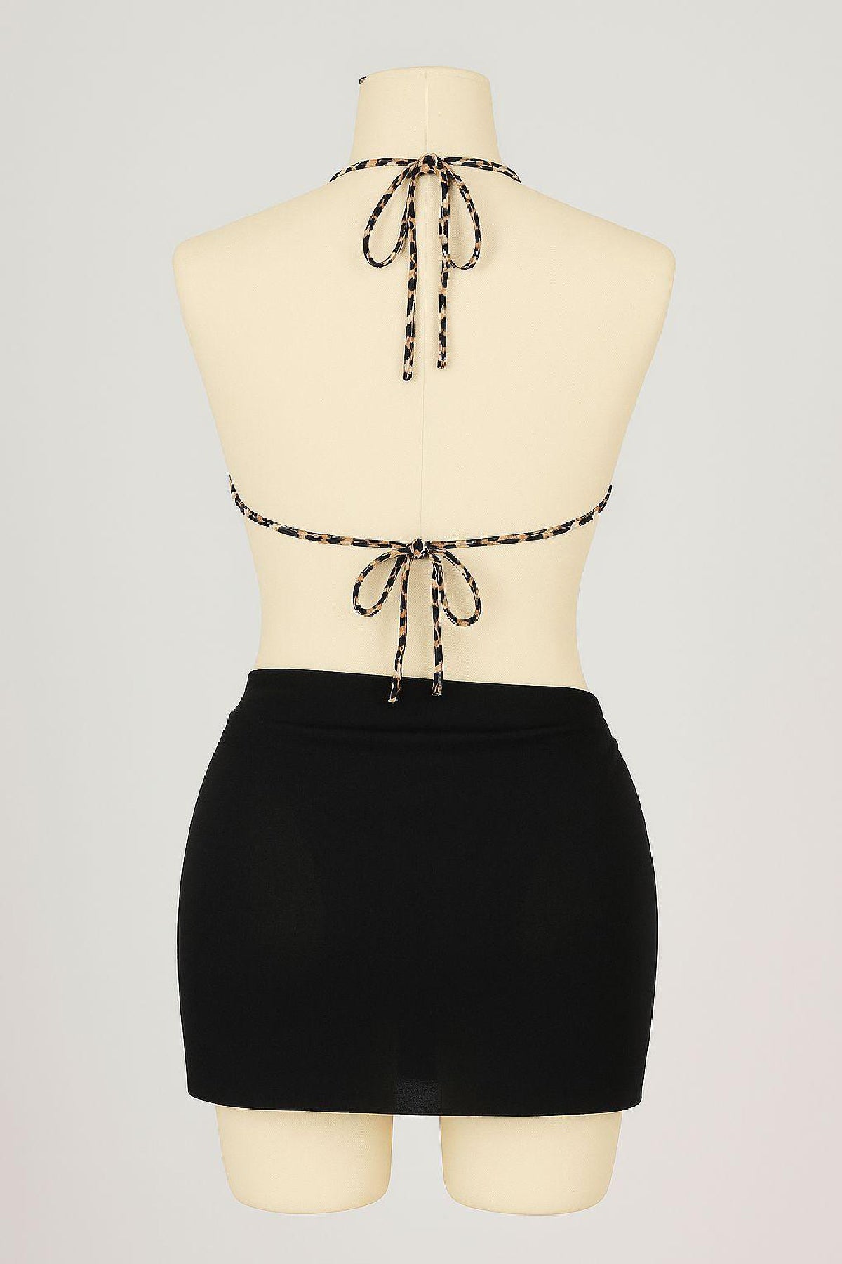 Leopar desenli ve siyah kombinasyonu ile şıklığı yansıtan bu üçlü bikini seti;