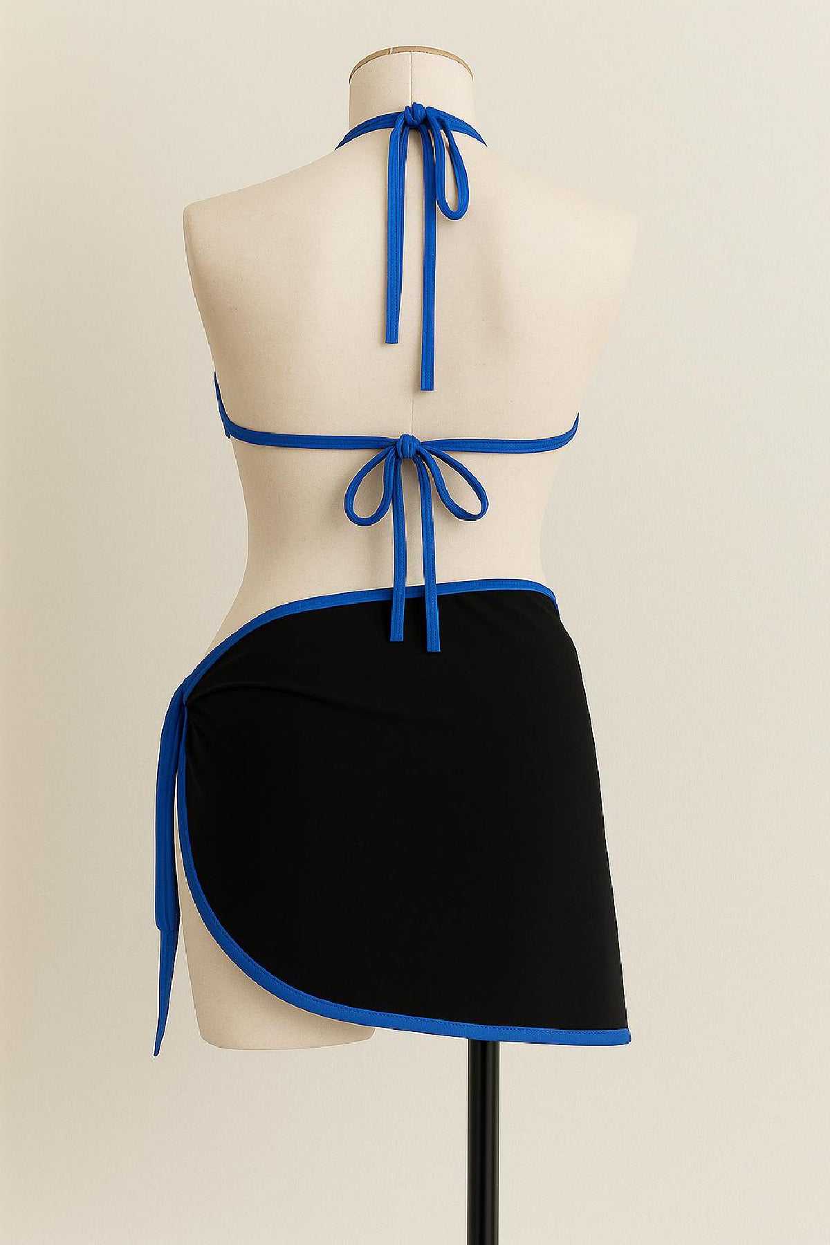 boyundan ve yandan bağlamalı üst, yanları ipli bikini altı ve pareo eteği ile plajlarda göz alıcı bir tarz sunar.