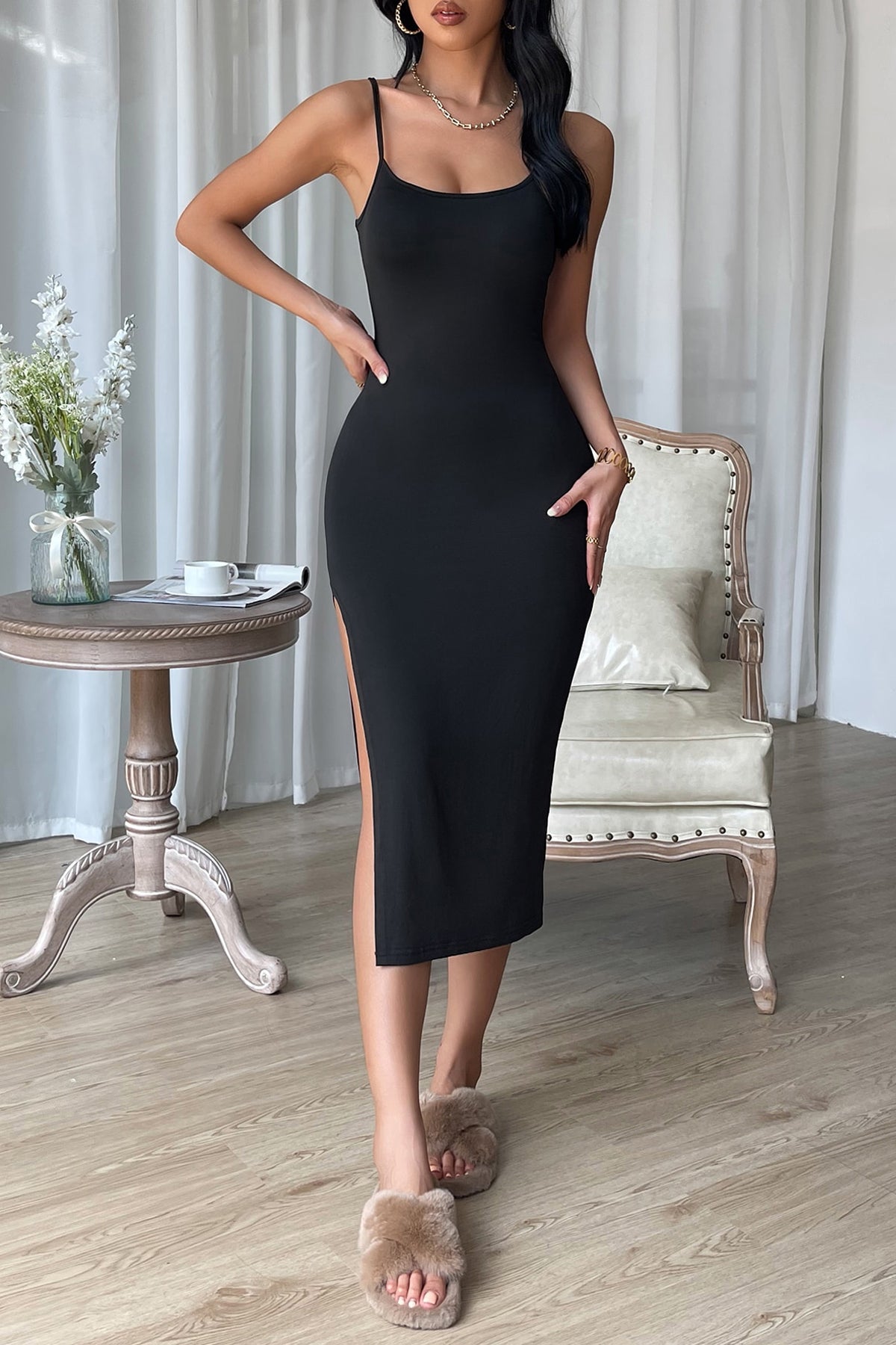 Kadın Siyah Yırtmaçlı Diz Altı Vücüdu Saran Gecelik