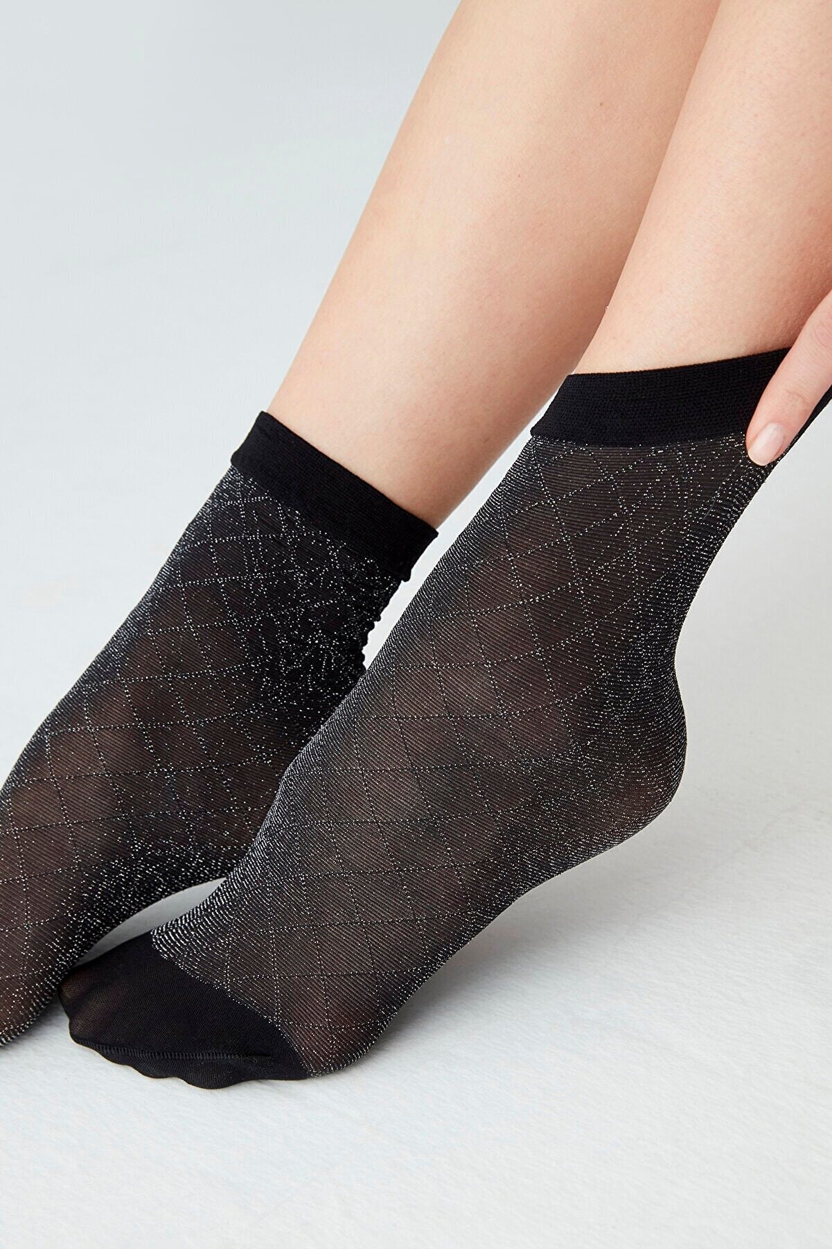 Siyah Simli Desenli Ince Soket Çorap Cross Shine